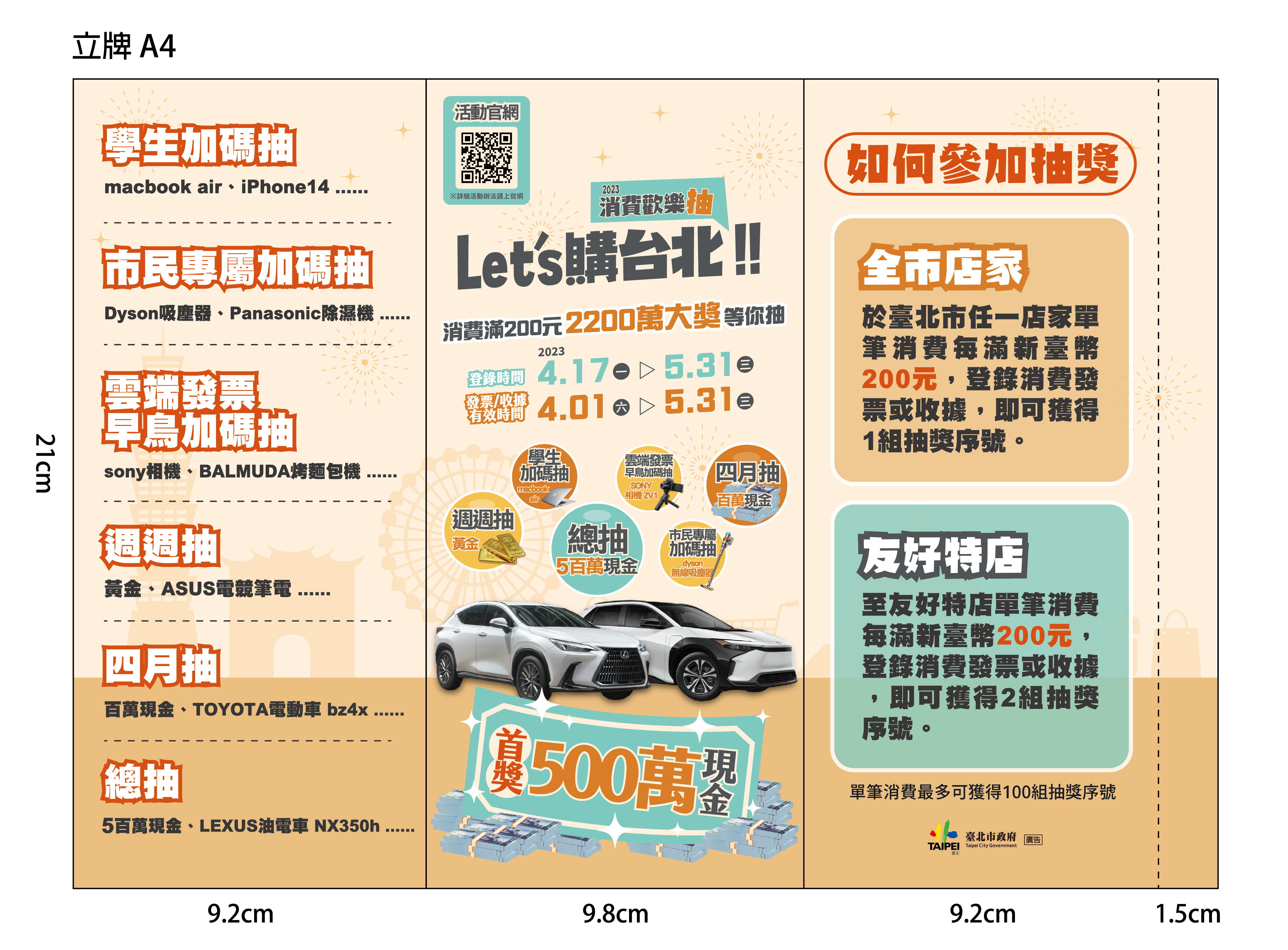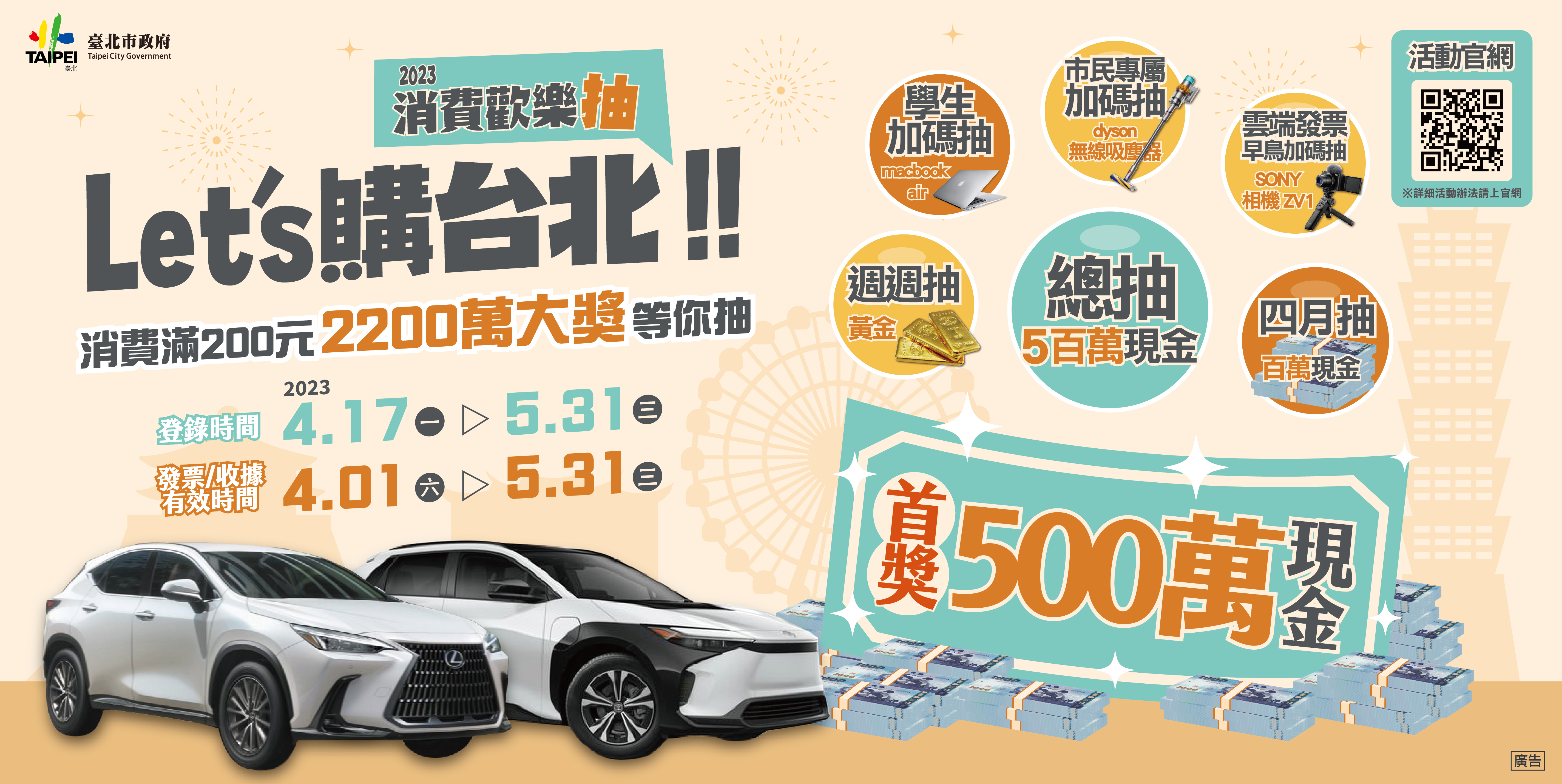 二、為響應中央普發新臺幣6,000元之政策,鼓勵民眾於臺北消費,臺北市政府自112年4月1日至112年5月31日辦理「2023Let’s購台北消費歡樂抽」消費抽獎活動,消費登錄週週抽、四月抽、總抽、學生加碼抽、雲端發票早鳥加碼抽、市民專屬加碼抽及母親節感恩抽等活動,並透過串聯北市超過1,000間以上友好特店,整合政府與民間資源共同行銷合作,以吸引民眾至北市遊逛消費,有效刺激購物,提升整體買氣,共同活絡商業發展。