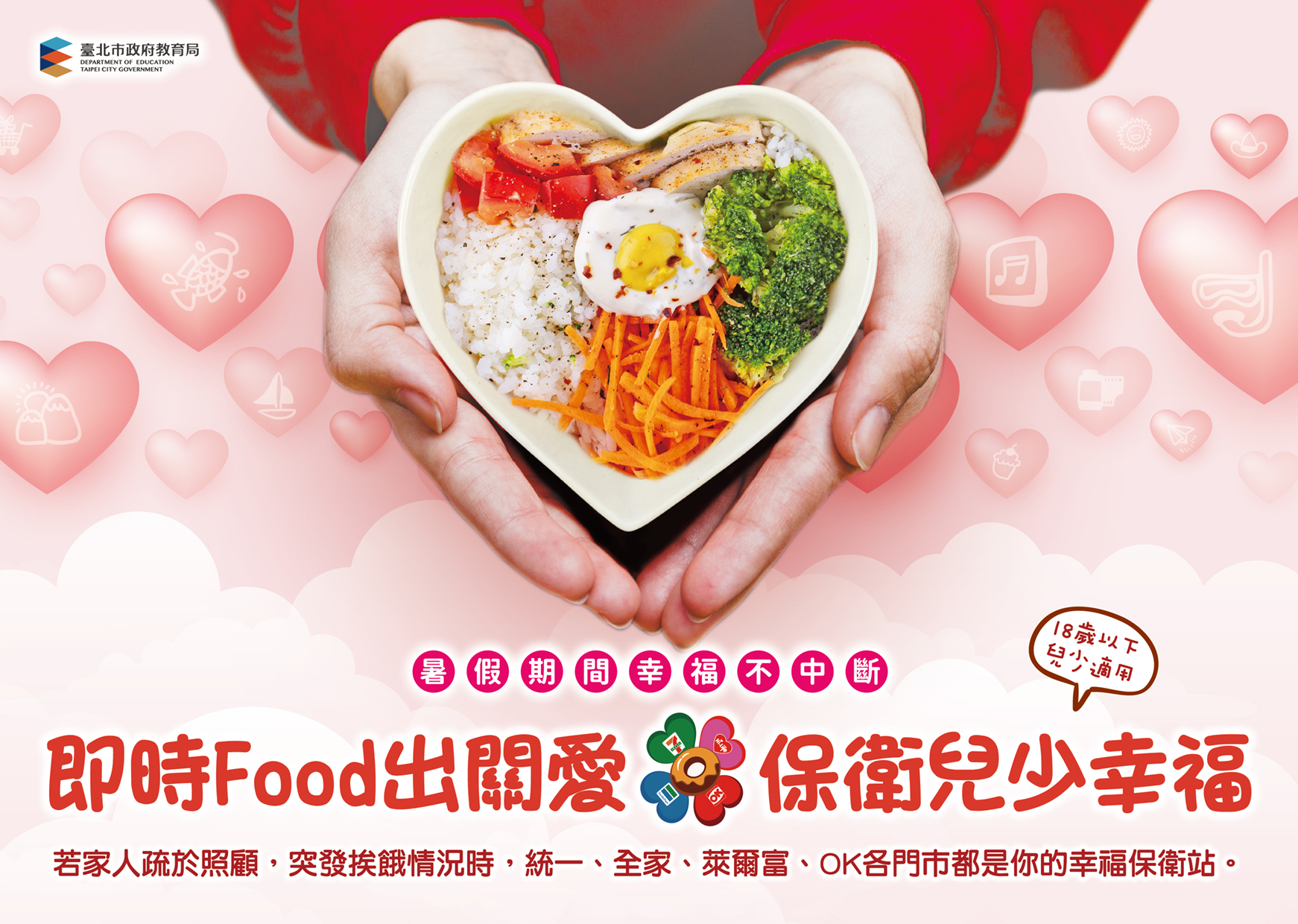 二、旨揭計畫業已於113年1月20日正式啟動,因應暑假即將來臨,為讓在假期中遭遇急難之兒少能善用資源,請各校利用本學期末之集會時間再次向全校師生宣導幸福保衛站,也透過家長會或家長群組轉知相關訊息,讓所有親師生知道「暑假期間陷困之兒少只要身處北臺八縣市範圍內,都可以就近向四大超商門市求助取餐。」
