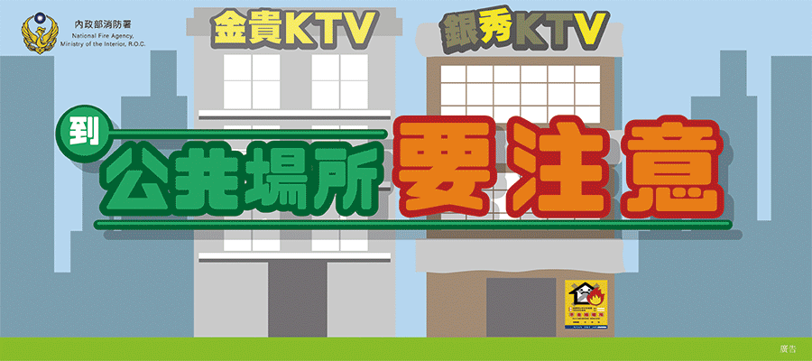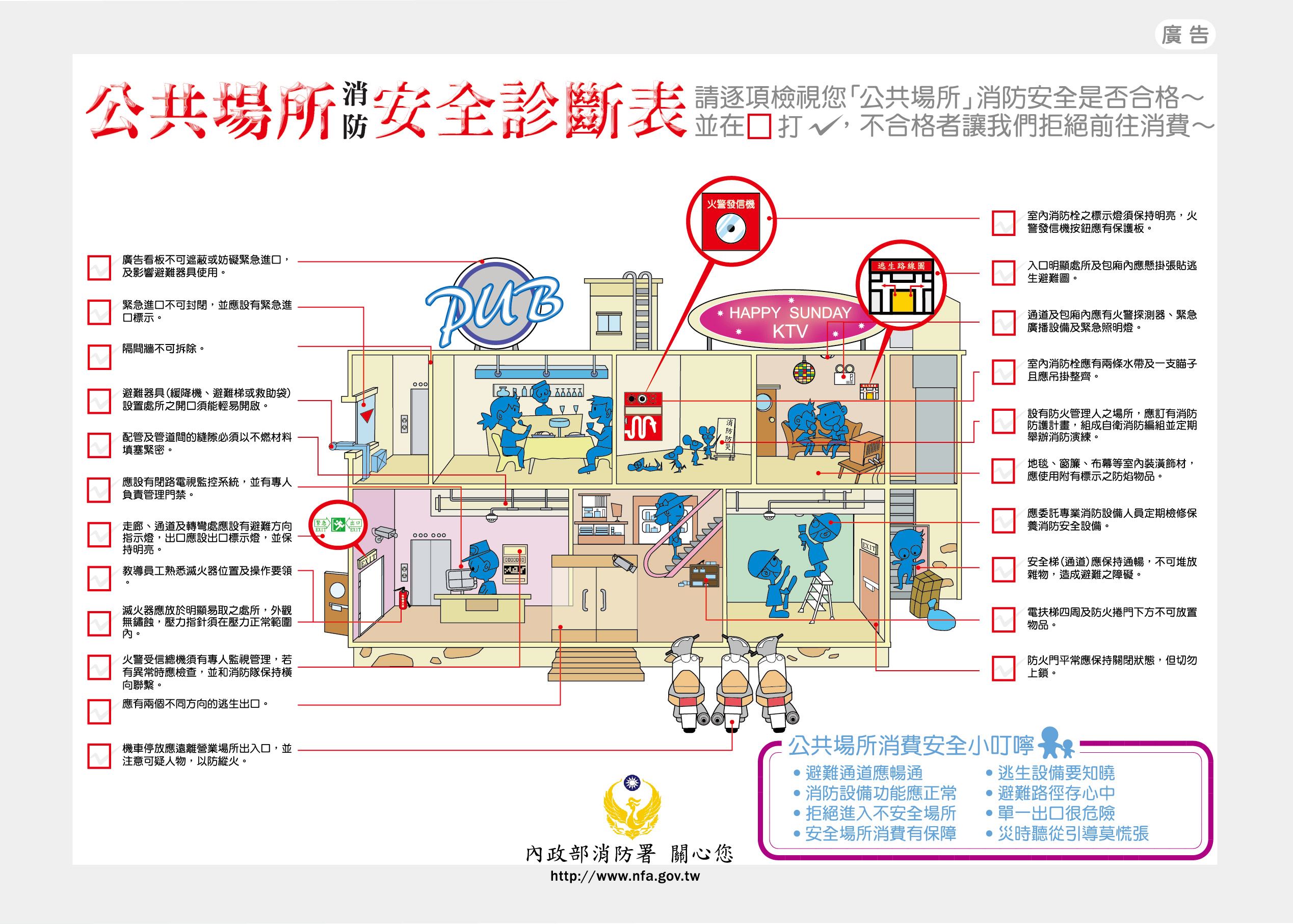 民眾進入公共場所時,應檢視是否張貼「不合格場所」告示,留意滅火器、室內消防栓等消防安全設備位置,並確認逃生路線,注意樓梯、走廊、通道及出口等路徑是否暢通無阻,以利火災應變及避難逃生使用。