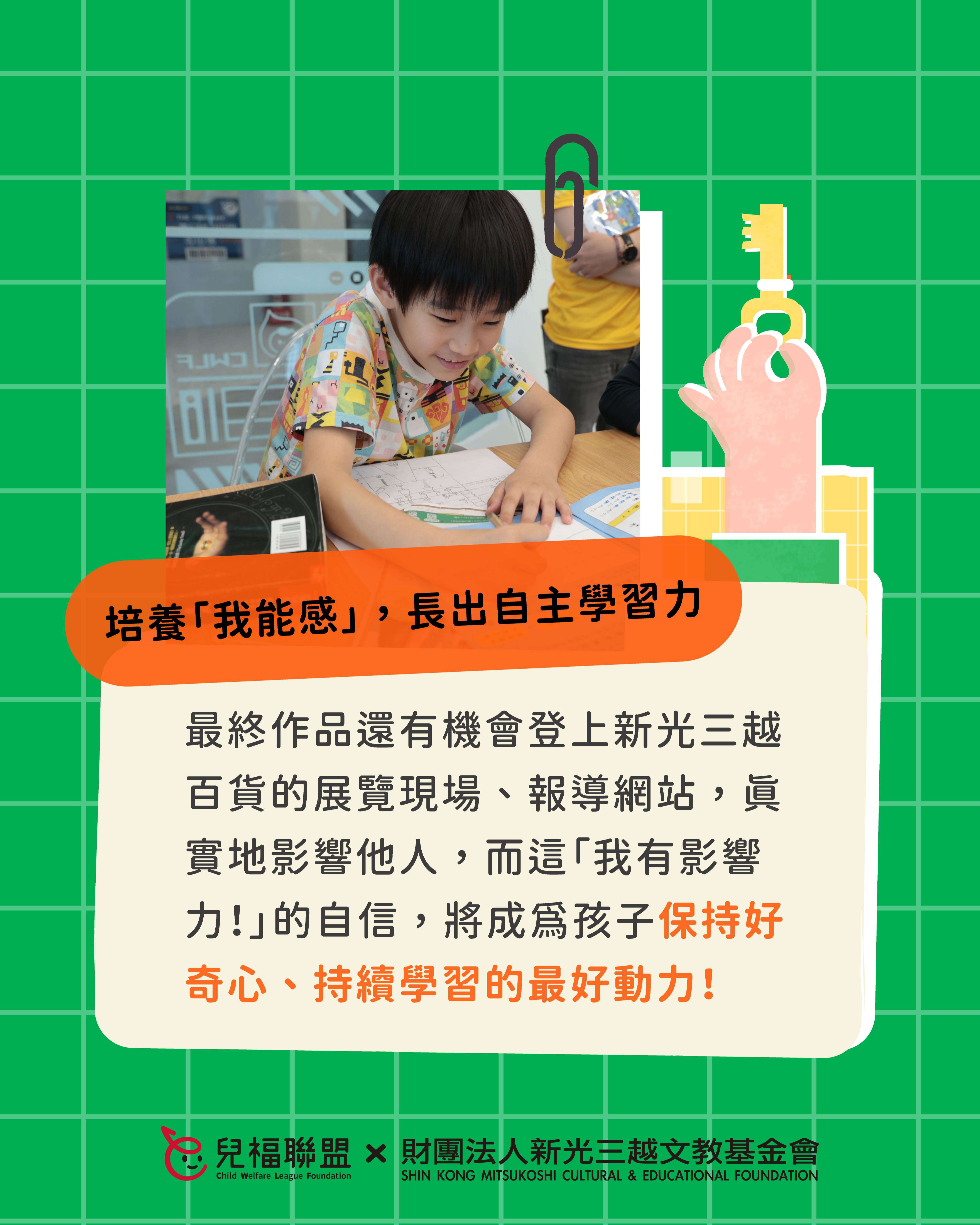 (五)完整學習歷程:完整學習歷程:課程循序引導孩子經歷「理解議題→深入探索→付諸行動影響他人」的培力過程,強化自信與行動力,培養孩子的自主學習技巧及意願。