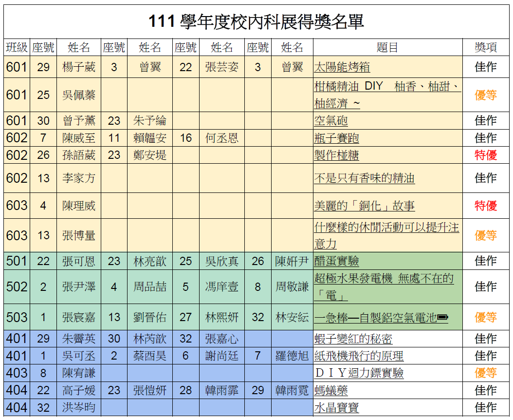 附件是111學年度校內科展競賽得獎名單,恭喜得獎的學生!