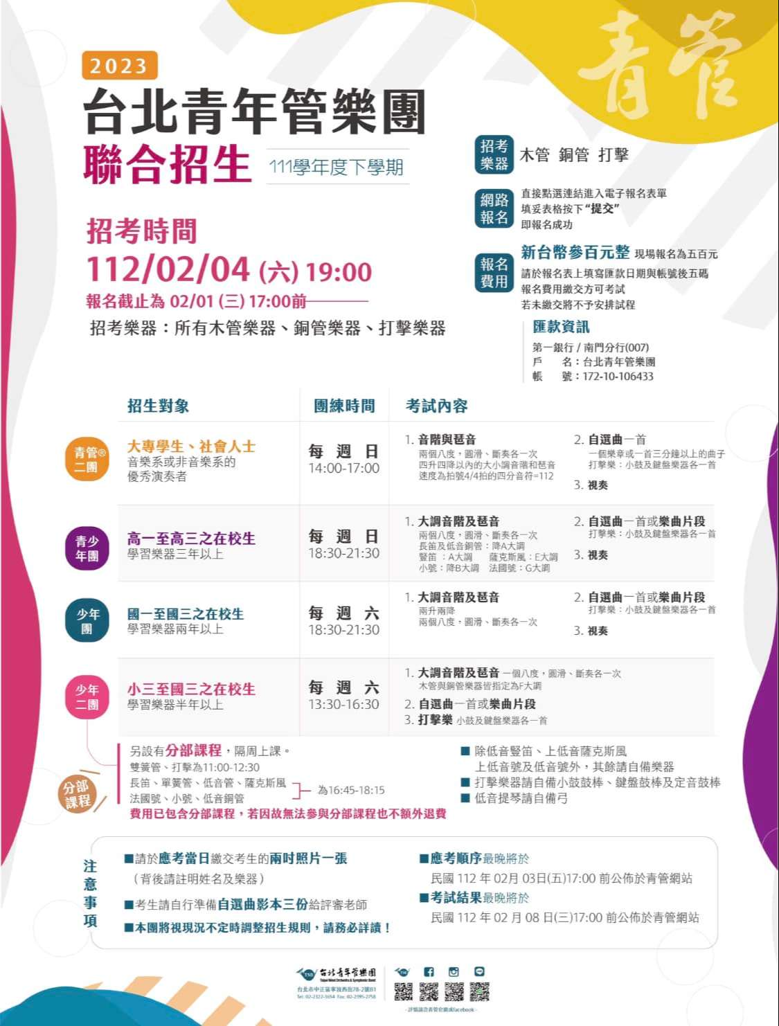 (三)考試簡章與報名請 見連結 (https://0rz.tw/4Orz9);相關問題請逕洽台北青管教學主任林老師(02-2322-3654)。