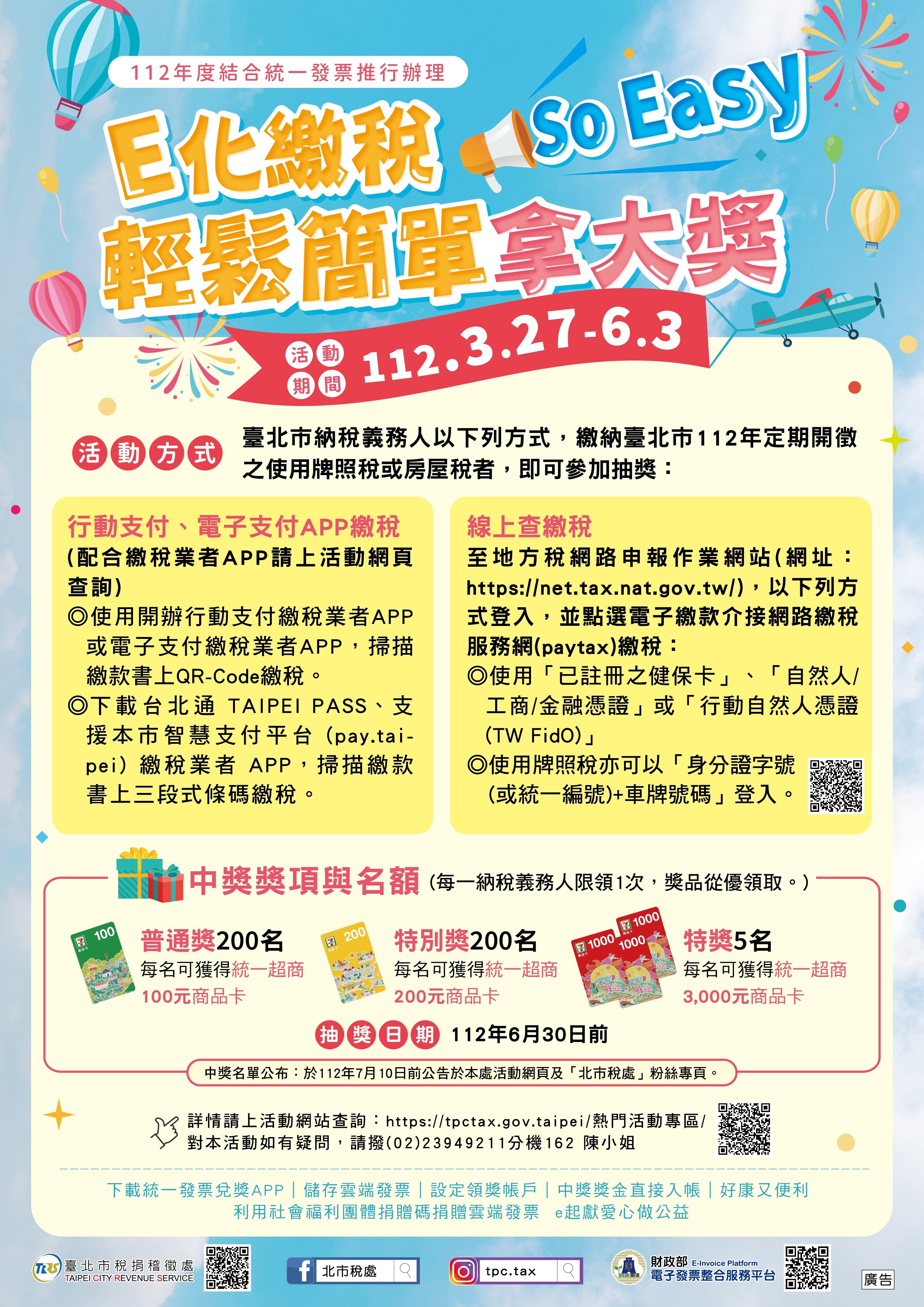 自112年3月27日至6月3日止,納稅義務人以線上查繳 稅方式或行動支付工具繳納臺北市112年定期開徵之使用牌照 稅或房屋稅,即可參加統一超商商品卡禮券抽獎。