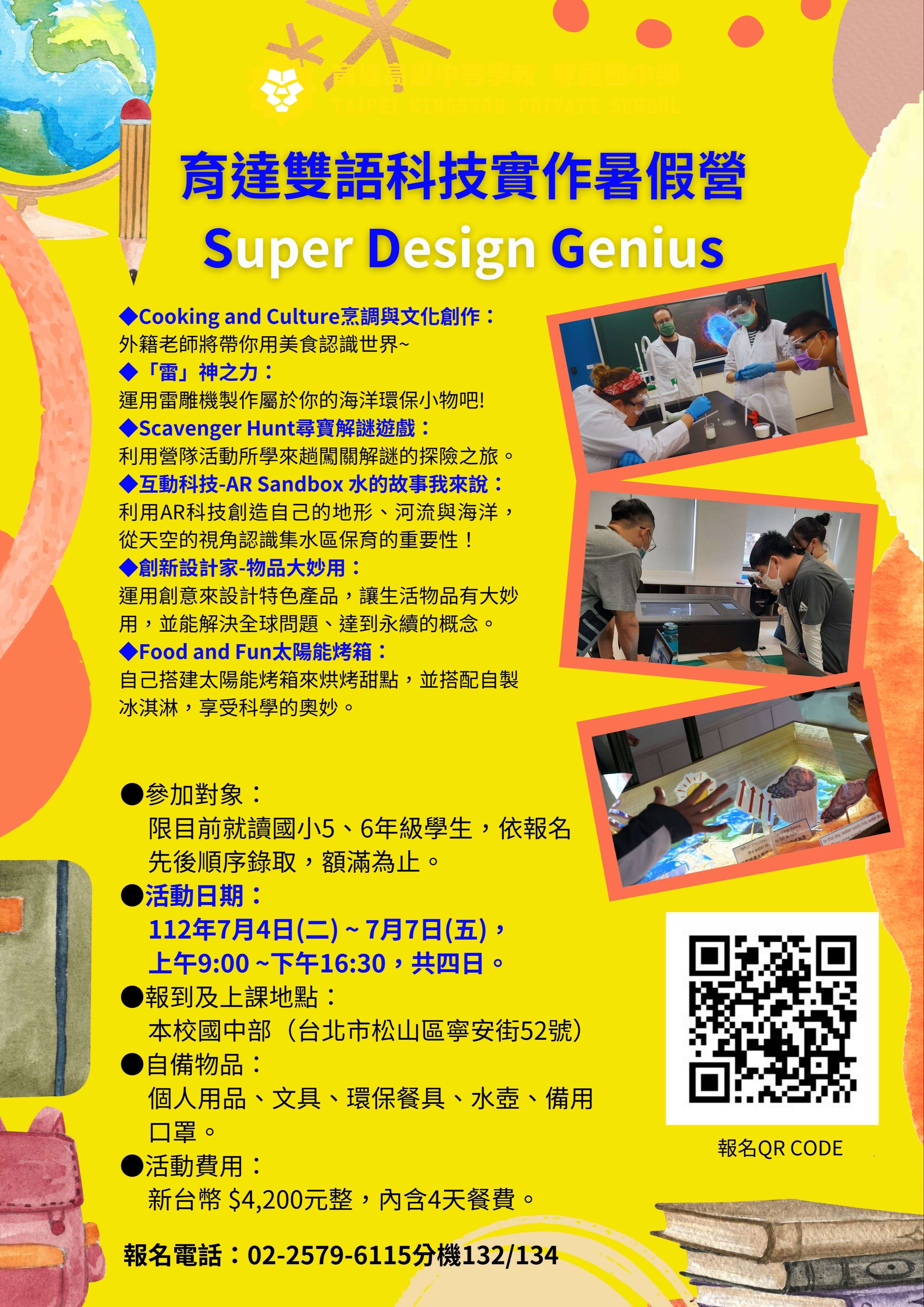 臺北市私立育達高級中等學校辦理「育達雙語科技實作暑假營隊 Super Design Genius」,歡迎本校5.6年級學生報名參加。