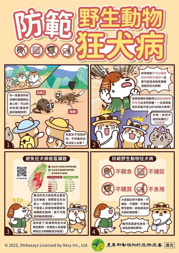 一、海報檔案已置於農業部檢疫署網頁狂犬病專區/宣導資料/文宣海報,可逕行下載列印使用或利用。