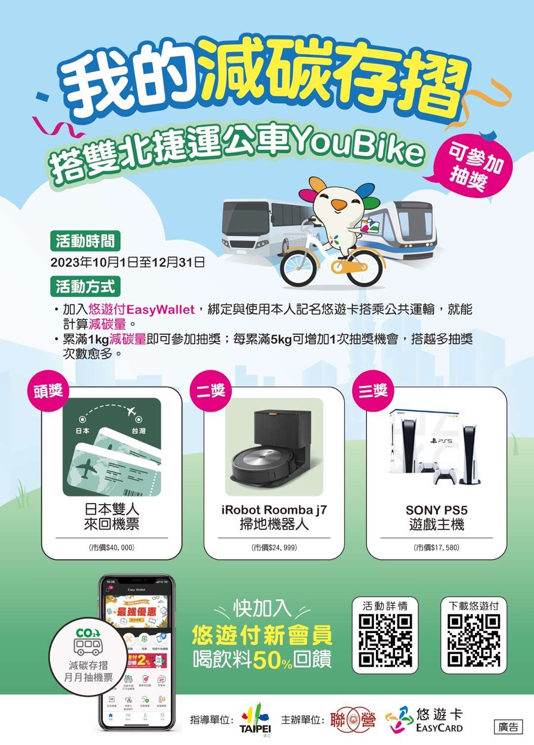 二、上開活動於112年10月1日至112年12月31日止,只要加入「悠遊付Easy Wallet」APP會員,綁定與使用本人記名悠遊卡,搭乘雙北公共交通運具(公車、捷運、輕軌及YouBike)就能計算減碳量。累計滿1kg減碳量即可獲得當月抽獎資格1次,每累計滿5kg,可再增加1次抽獎機會,累計滿10kg則多2次,以此類推,搭乘公共運輸越多,就有越多中獎機會。