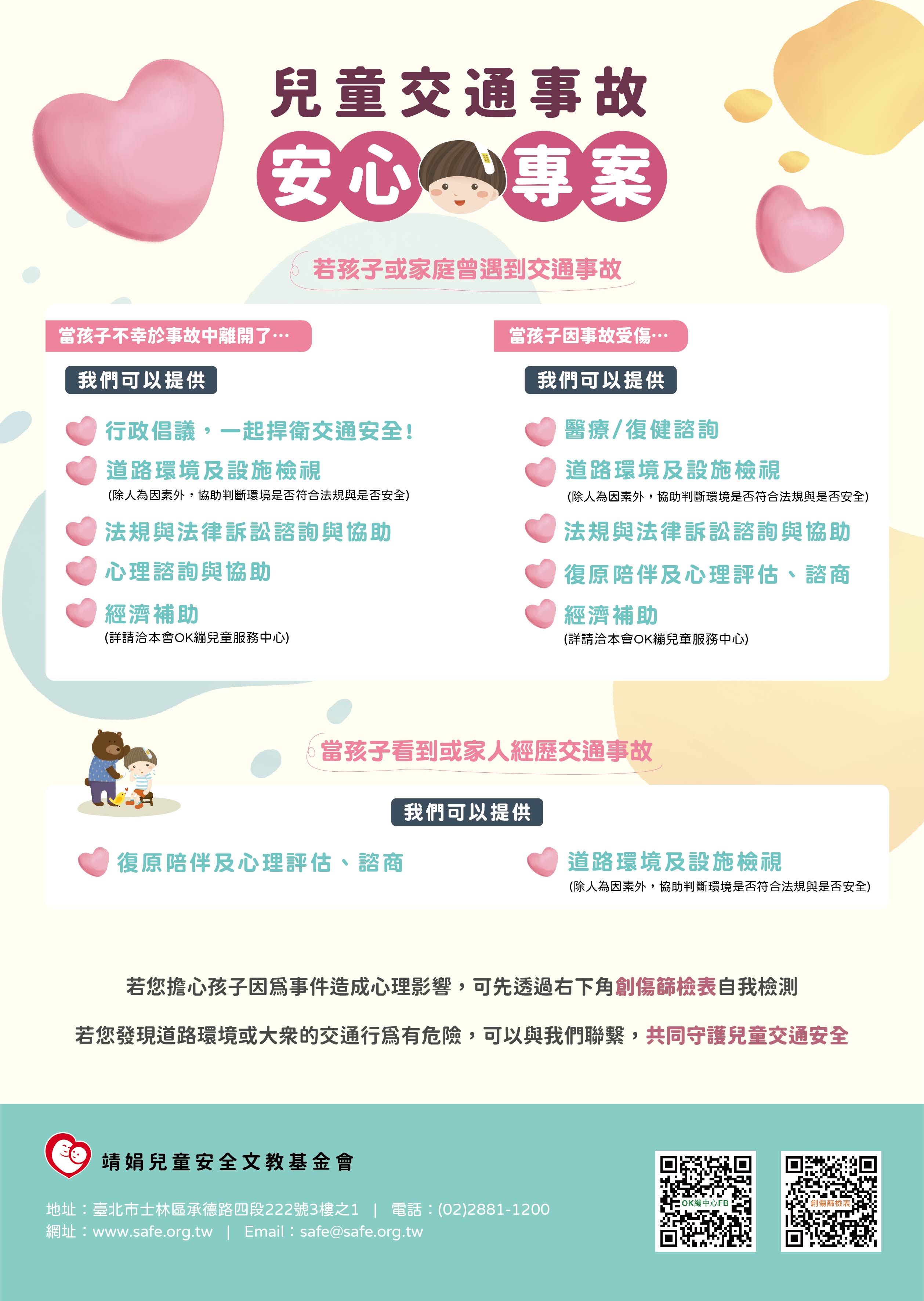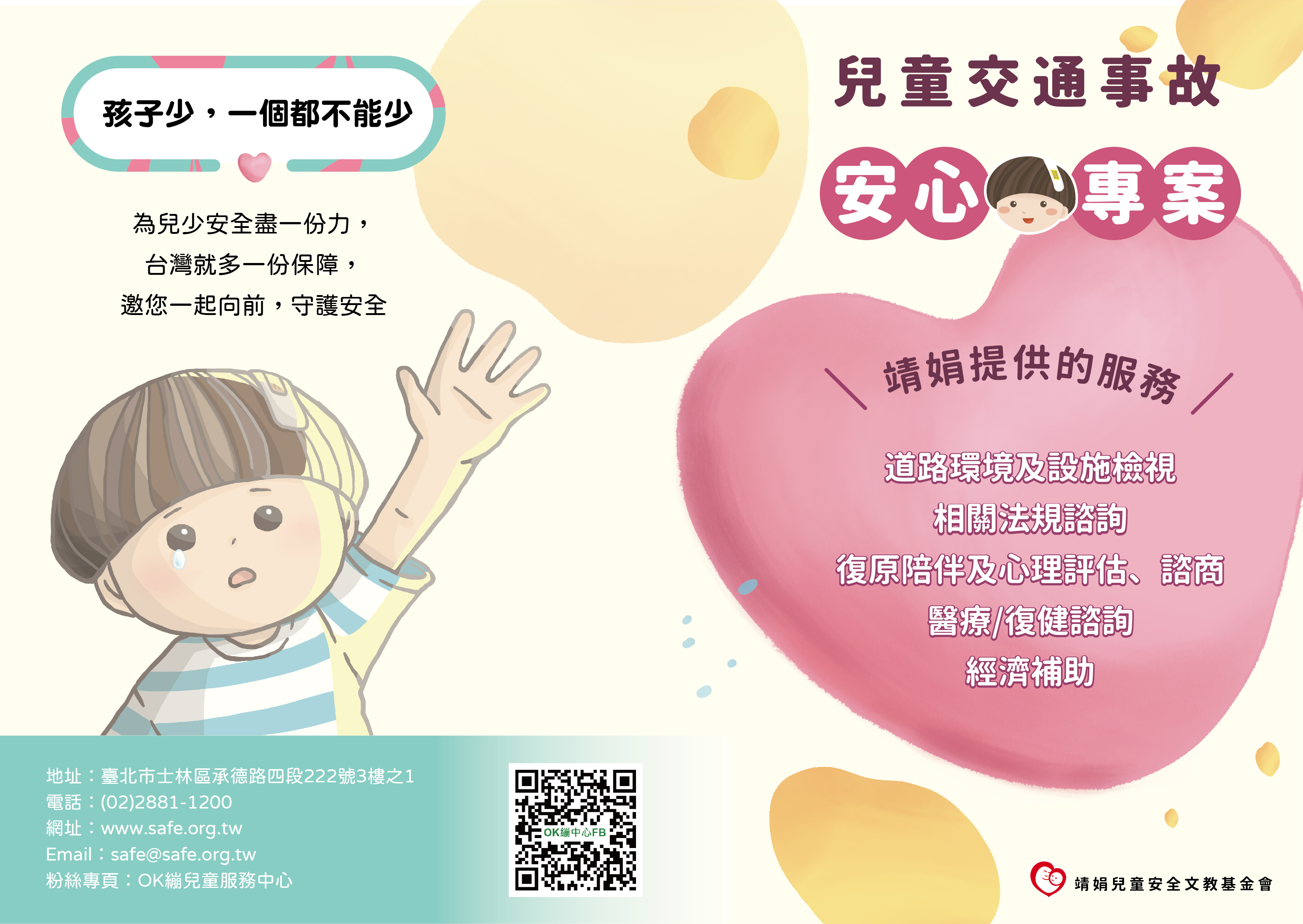 一、為協助兒少及其家庭面對交通事故後之問題及穩定就學,靖娟基金會自110年開辦「兒少交通事故安心專案」,以經歷交通事故之兒少為核心,提供法律、醫療、心理、環境檢視與行政倡議之服務。