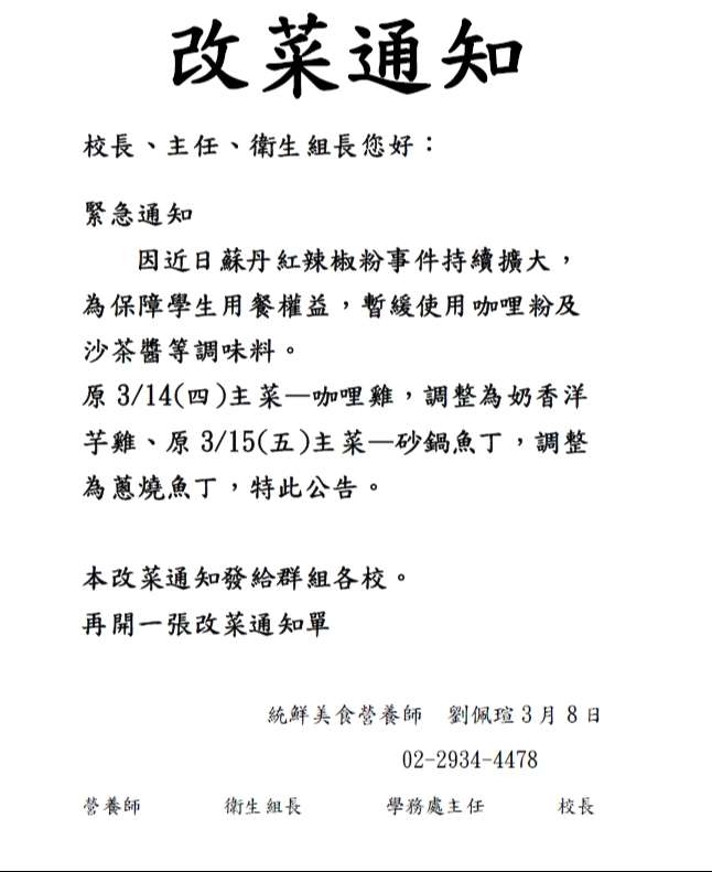 本市高級中等以下學校午餐全面暫停使用有疑慮的調味品部分,進行菜單修正: