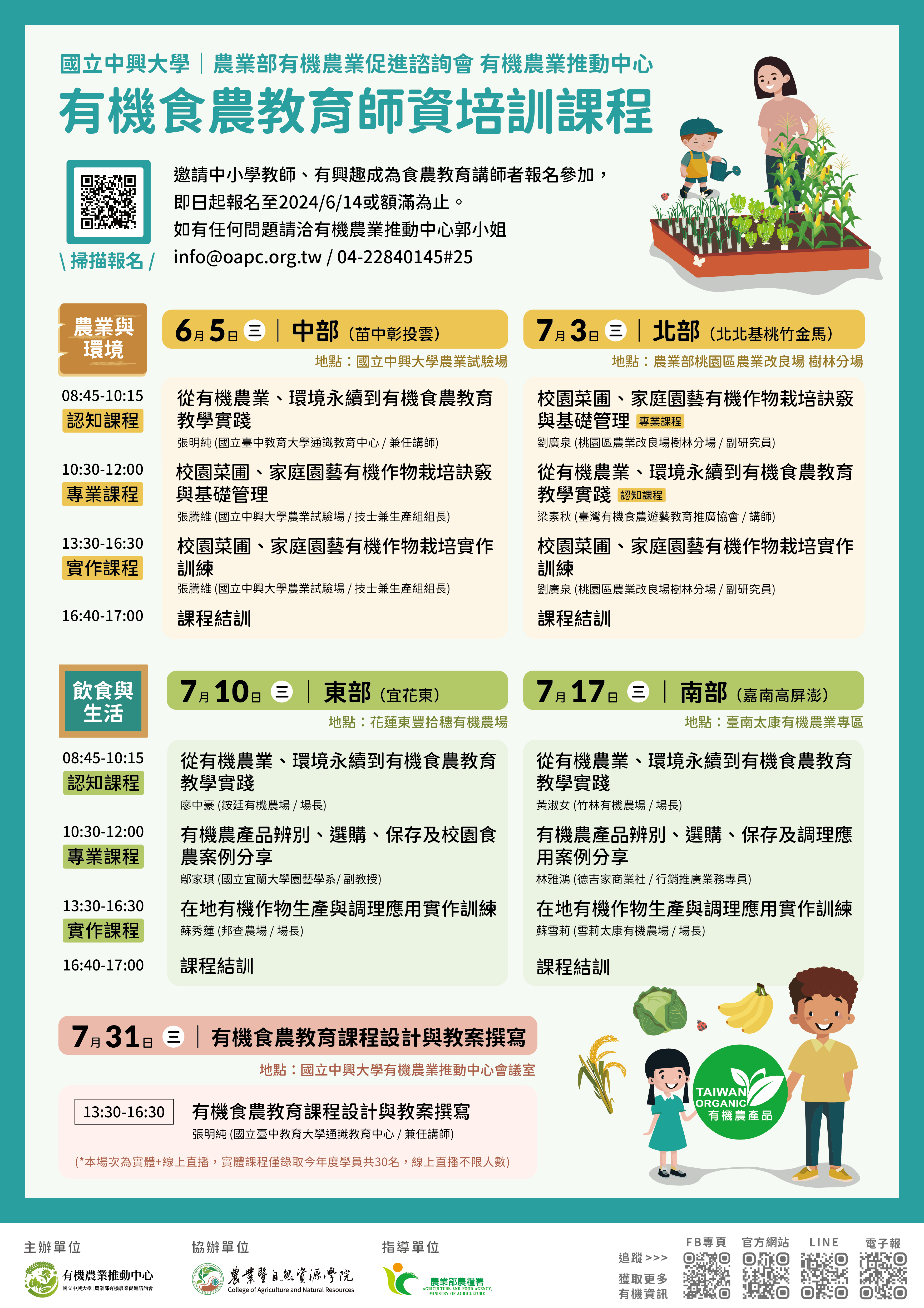 一、為提升食農教育師資之有機農業相關認知與實作教學,及強化有機食農教育師資之專業性,國立中興大學有機農業推動中心辦理「有機食農教育師資培訓課程」,辦理資訊說明如下: