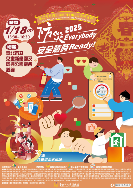 114年1月18日(星期六)13時30分至16時30分,假臺北市立兒童新樂園及周邊公園縫合道路舉行「防災Everybody 安全隨時Ready!」防災園遊會,內容有互動闖關學防災、消防文創手作樂、火災求生大作戰,歡迎您來挑戰,闖關集點就送精美禮品,119防災宣導活動,邀請全家大小一起出來玩,透過宣導攤位與民眾互動、傳達及教導民眾家庭防災之觀念,以提升民眾居家生活安全。