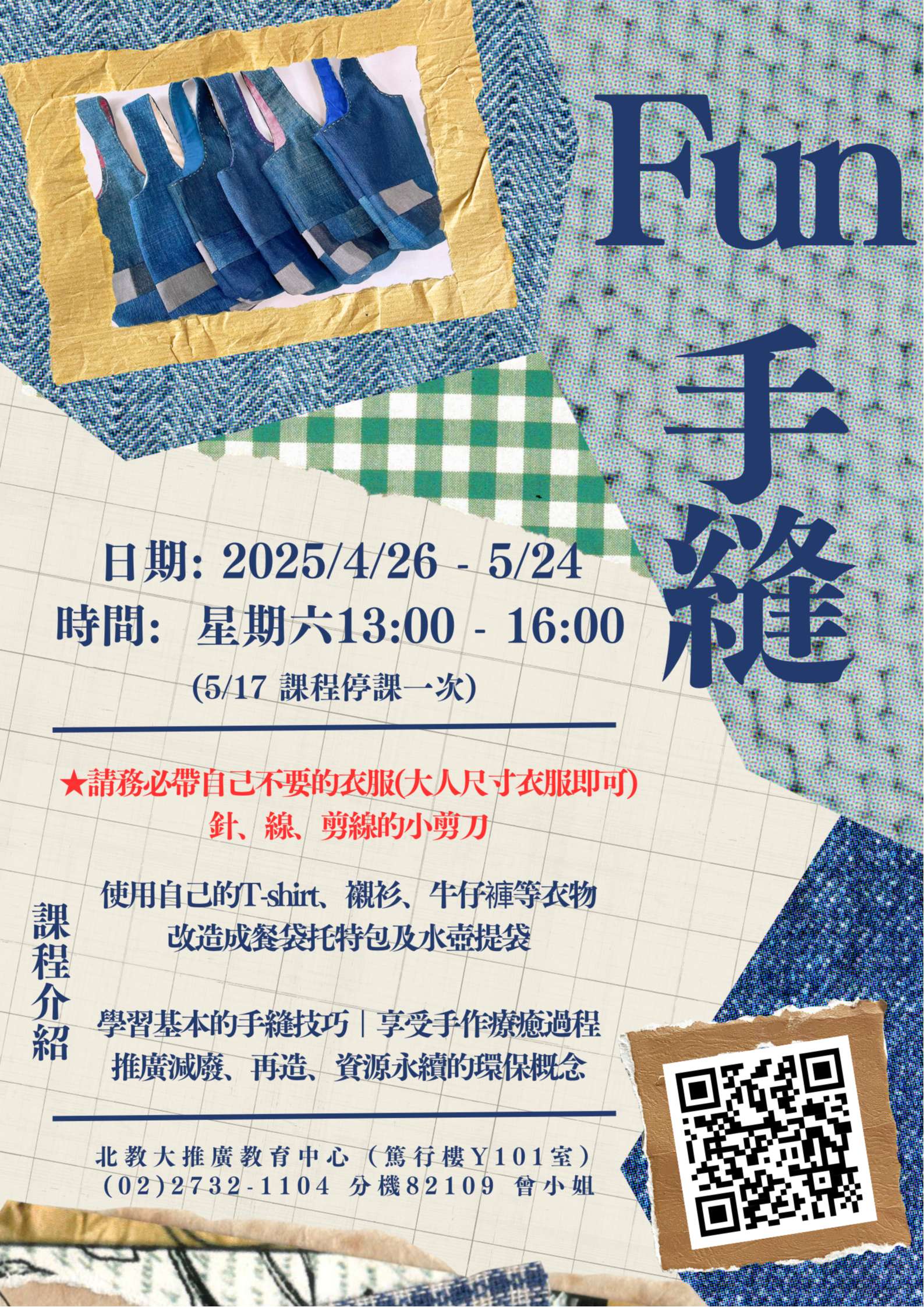 一、本校推廣教育中心辦理為期四週的生活藝術系列課程,即日起開放報名,課程資訊如下:生活藝術系列—Fun手縫 (HandMay五月場)