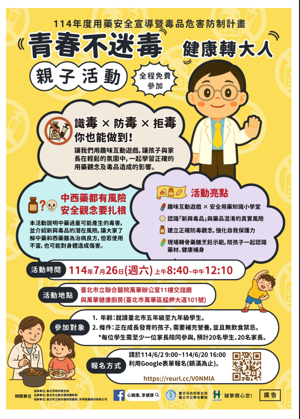 一、為推廣「用藥安全知識及毒品防制」正確觀念,敬邀本市五年級至九年級學生及家長參與,藉由活動引導加強民眾用藥安全及毒品危害防制藥物濫用之觀念,特於暑期辦理親子活動,希望提升未成年學子對於反毒以及藥物濫用之重要性,進一步提升健康識能。