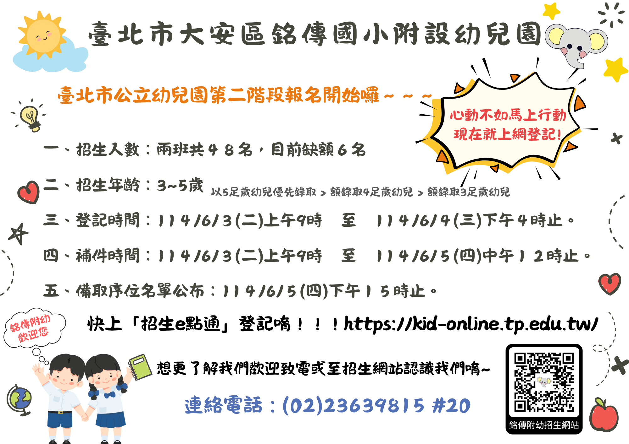 銘傳附幼招生網頁:https://sites.google.com/mhps.tp.edu.tw/mhpskinder-enroll/
