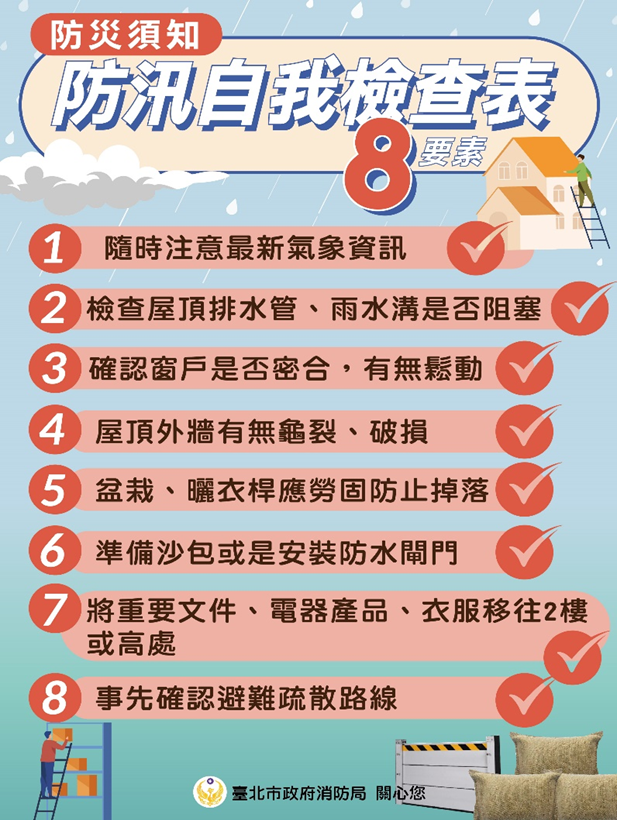 汛期即將來臨,請民眾提前做好清淤排水,注意氣象與災害資訊,提高警覺。若前往山區或河邊等地區,應隨時注意環境變化,如發現任何異常,應馬上撤離,以維生命安全。