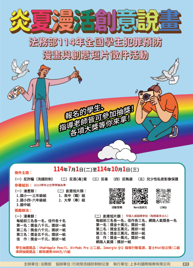 三、徵件期間自114年7月1日至114年10月1日,採線上報名;徵件活動相關訊息及報名資料,請至活動官網(https://www.mojgov2025.com.tw/)、法務部「More法狀元」網站(https://tpmr.moj.gov.tw)之「年度活動」,以及facebook搜尋「More法狀元-兒童及青少年犯罪預防宣導網」下載。