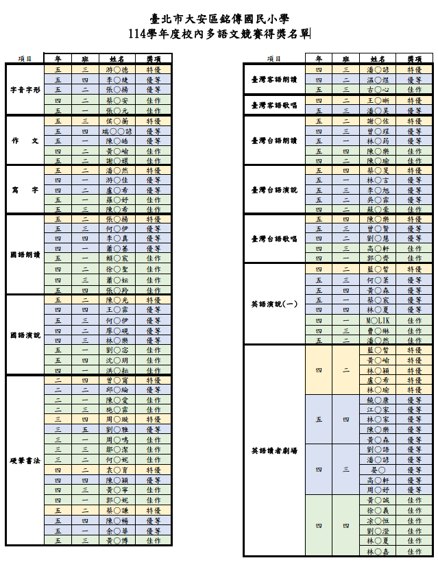 臺北市大安區銘傳國民小學 114學年度校內多語文競賽得獎名單