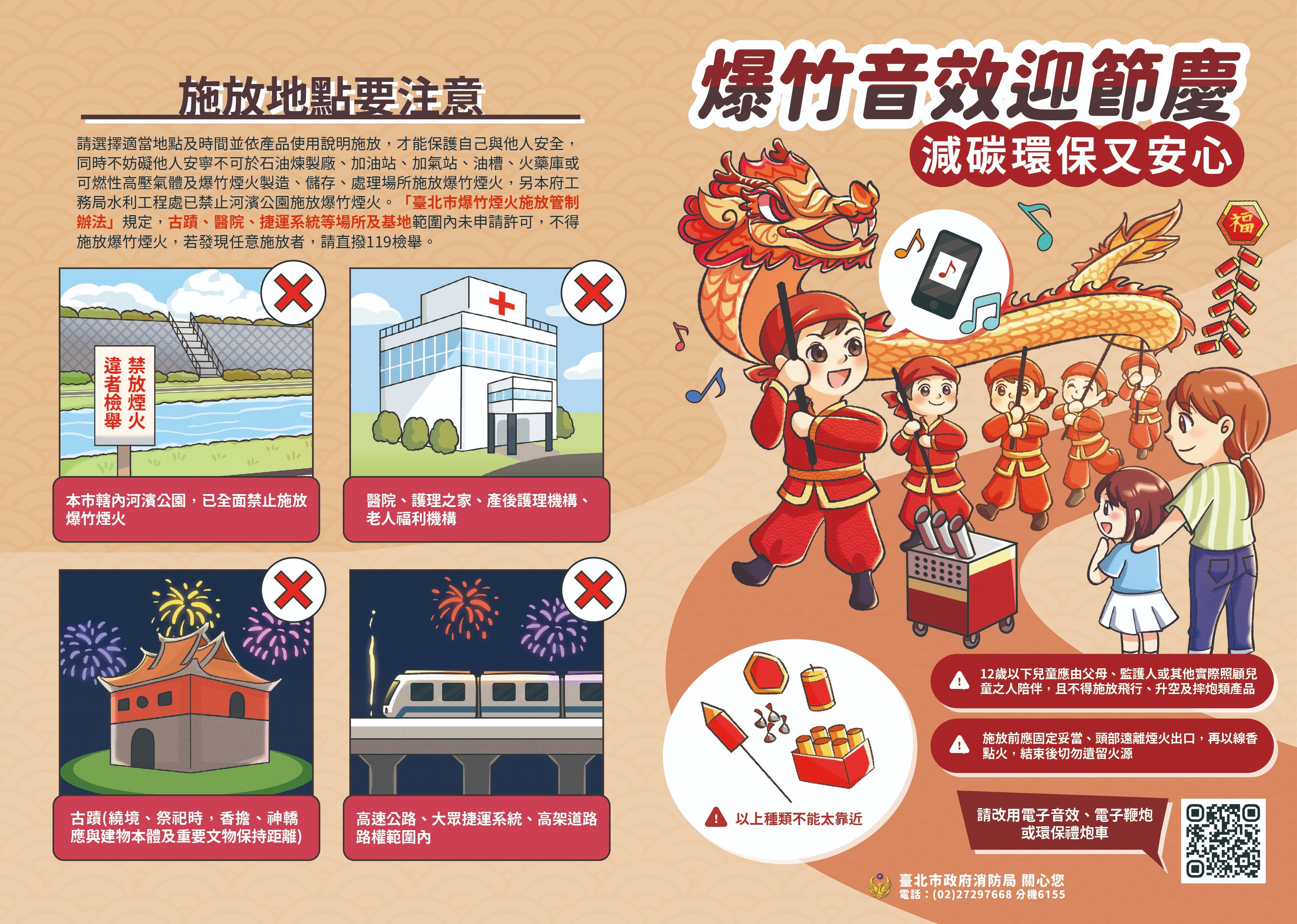 四、「臺北市爆竹煙火施放管制辦法」已規範高速公路、大眾捷運系統及高架道路路權範圍內、古蹟、醫院、護理之家、產後護理機構及老人福利機構等場所及基地範圍內,不得施放爆竹煙火,請以電子鞭炮或爆竹音效替代傳統爆竹燃放,爆竹燃放音效可至本市消防局網站( 連結)下載使用。
